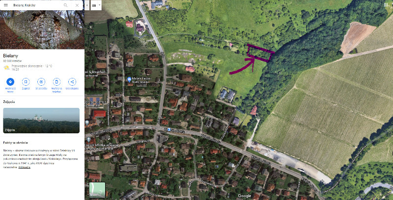 Dojazd od ulicy Księcia Józefa w górę ulicy Orlej (ok 250 m) (potem boczna droga gruntowa aż do lasu)