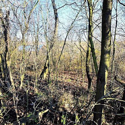 Płaski teren od strony wjazdu (drogi asfaltowej) w dalszej części nachylenie terenu.