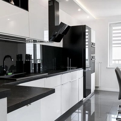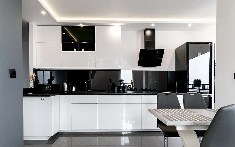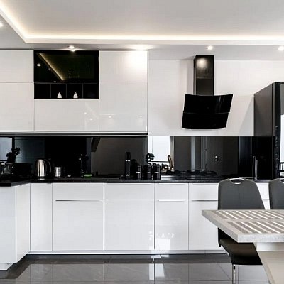-Aneks kuchenny wyposażony jest w: lodówkę z zamrażalnikiem, płytę indukcyjna, zlewozmywak, stół z czterema krzesłami.