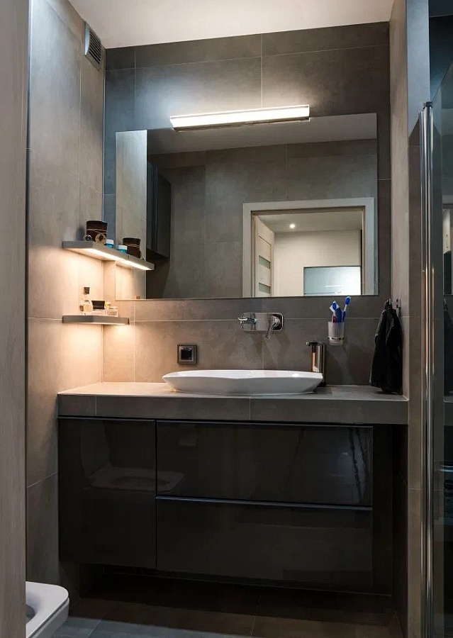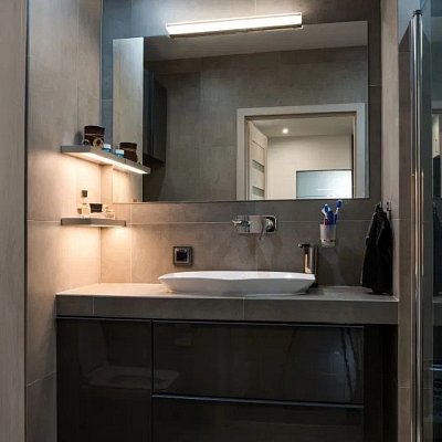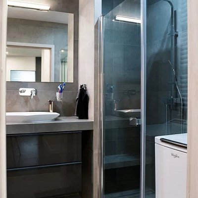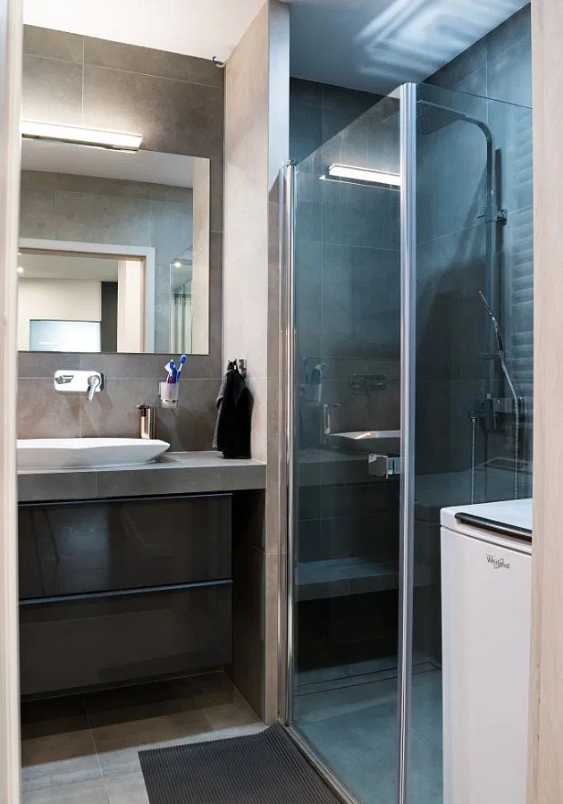 -W łazience znajdziemy: kabinę prysznicową, umywalkę z szafką, pralkę, lustro oraz WC.