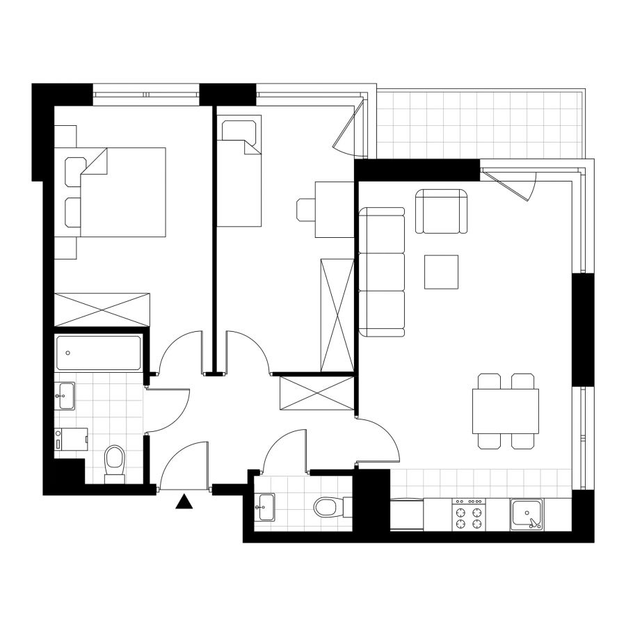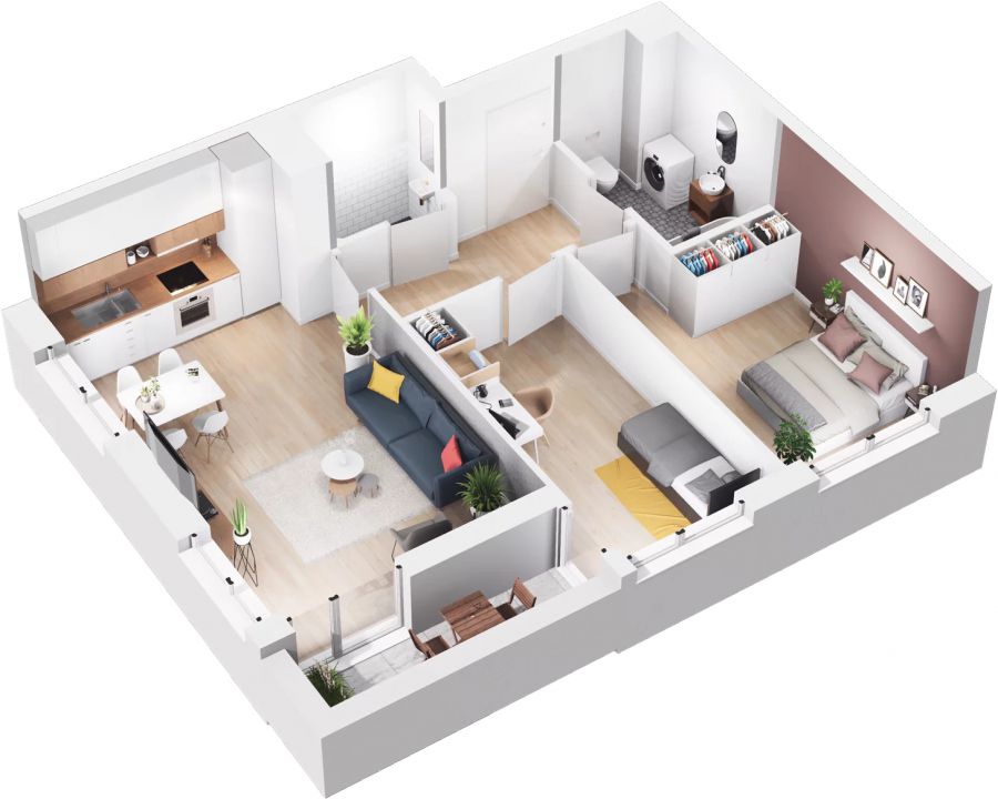 Prezentowane mieszkanie o powierzchni 59,50 m2 składa się z 2 osobnych pokoi, pokoju z aneksem kuchennym, łazienki, wc, przedpokoju i loggi.