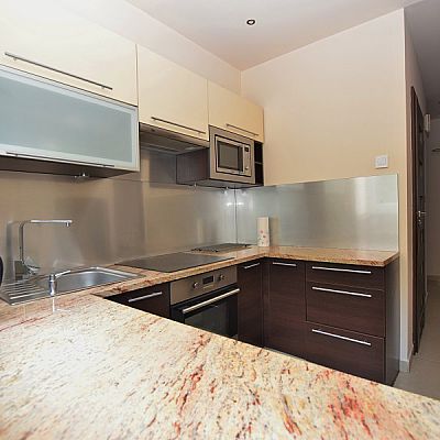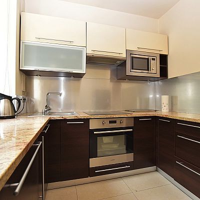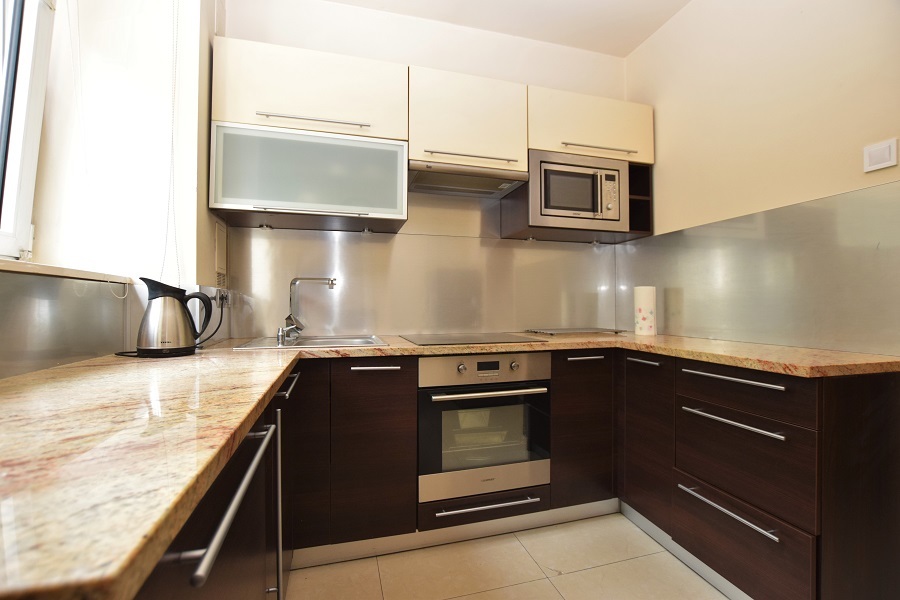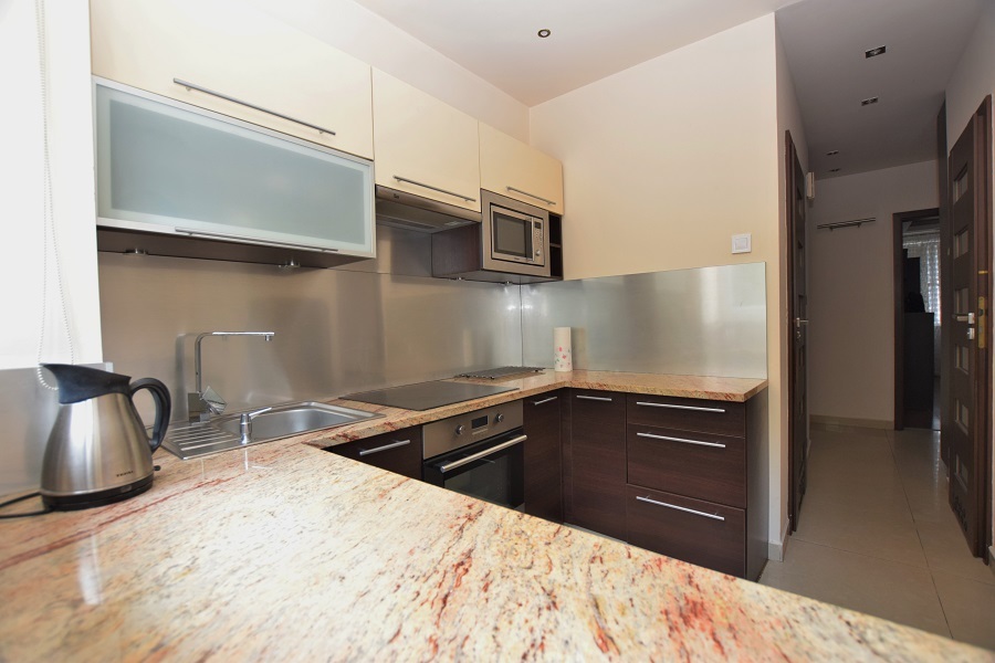 Kuchnia wyposażona jest w niezbędne sprzęty takie jak zmywarka, płyta grzewcza, zamrażarka, lodówka, piekarnik.