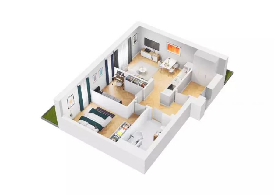 Prezentowane mieszkanie o powierzchni całkowitej 51,97 m2 znajduje się na parterze i składa się z 3 pokoi (w tym salon z aneksem kuchennym), łazienki, korytarza i wiatrołapu.