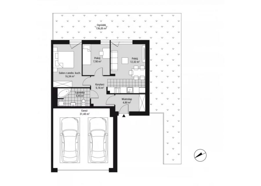 Do mieszkania przynależy również garaż wewnętrzny o powierzchni 31,40 m2 oraz ogródek o powierzchni 136,05 m2.