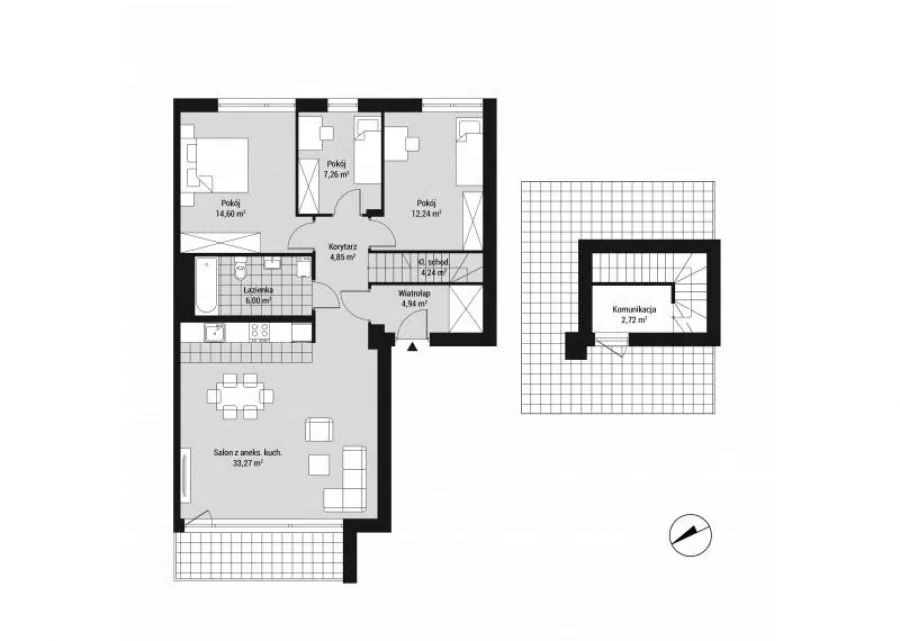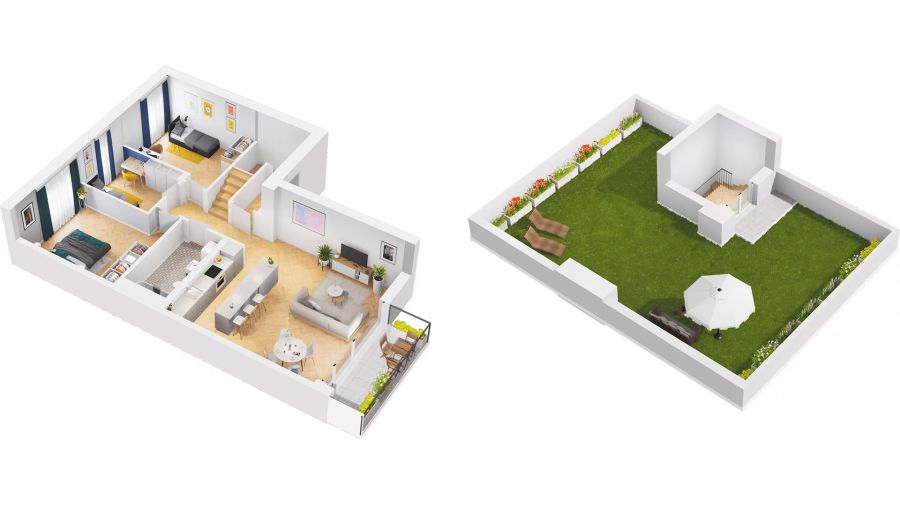 Prezentowane mieszkanie o powierzchni 90,12 m2 znajduje się na 1 piętrze i składa się z 3 pokoi, salonu z aneksem kuchennym, łazienki, korytarza i wiatrołapu. Do mieszkania przynależy również zielony taras na dachu budynku.