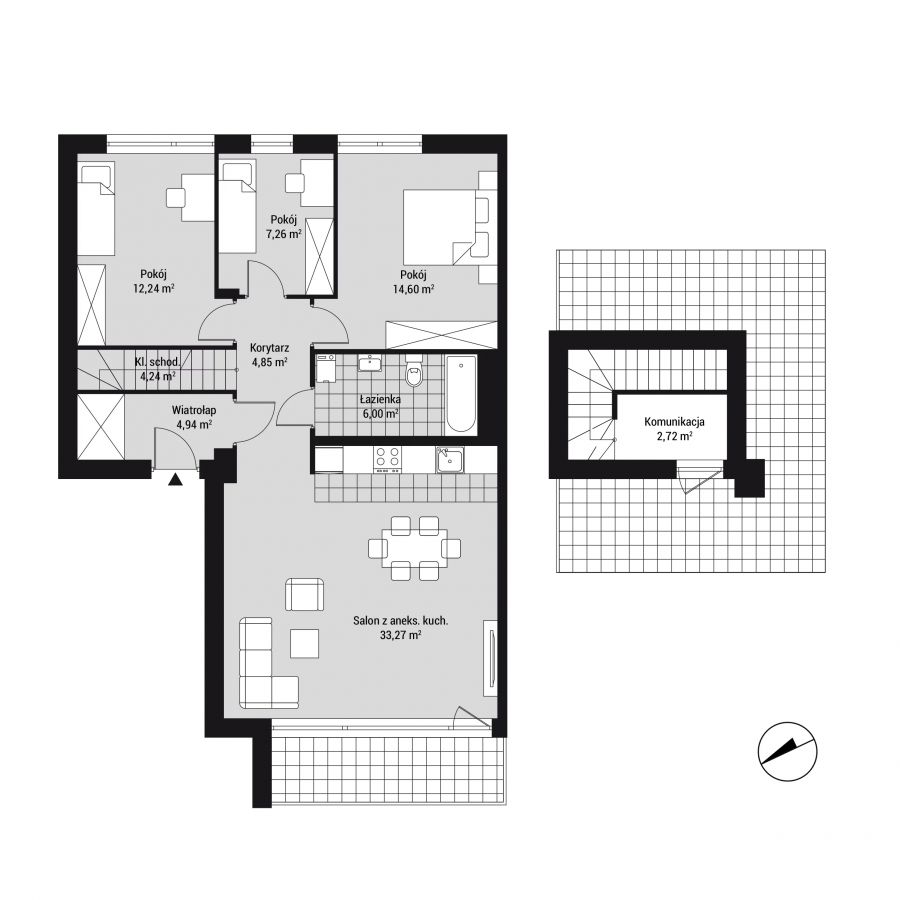 Prezentowane mieszkanie o powierzchni 90,12 m2 znajduje się na 1 piętrze i składa się z 3 pokoi, salonu z aneksem kuchennym, łazienki, korytarza i wiatrołapu. Do mieszkania przynależy również zielony taras na dachu budynku.