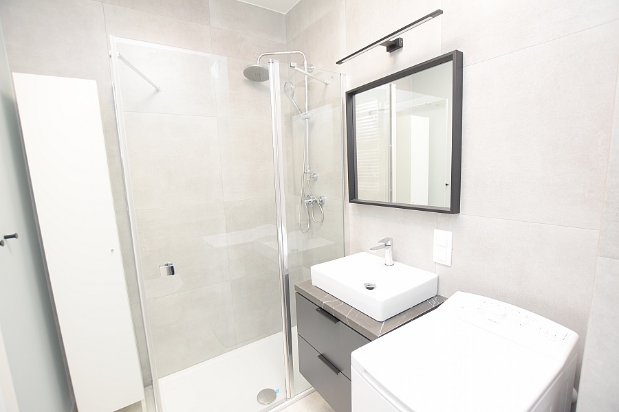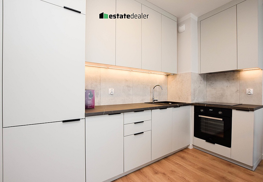 Kuchnia wyposażona została we wszystkie niezbędne sprzęty takie jak piekarnik, zmywarka, oraz duża lodówka z zamrażarką.