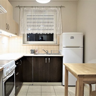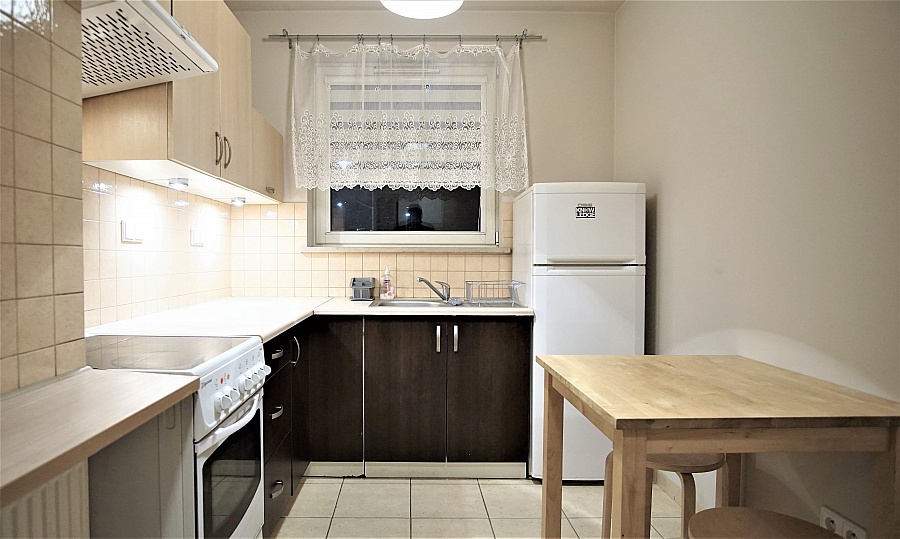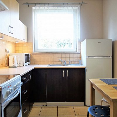 - Kuchnia w tym mieszkaniu jest osobnym pomieszczeniem z oknem. Wyposażona w płytę elektryczną z piekarnikiem, lodówkę z zamrażarką, mikrofalę, wiele szafek ze sprzętem oraz stół z krzesłami.
