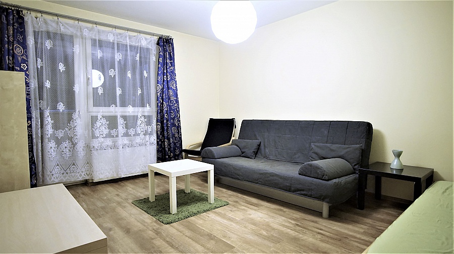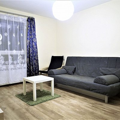 - W jasnym salonie będziesz mógł/mogła świetnie się zrelaksować na dwuosobowej sofie. Aktualnie znajduje się tu też drugie łózko, które właściciel bez problemu może zabrać. Stąd też jest wyjście na duży balkon.