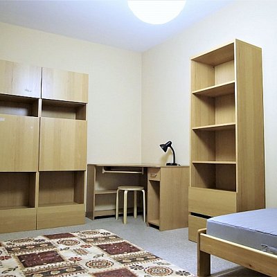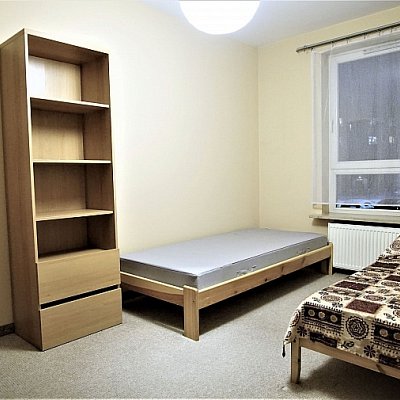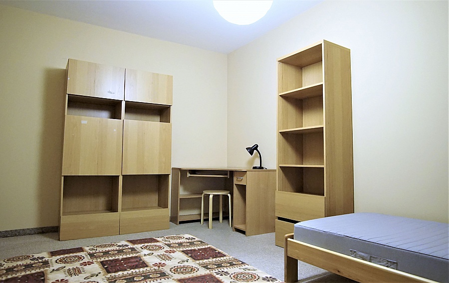 - W drugim pokoju jest łóżko z materacem, biurko z fotelem i kilka regałów. Możliwość wstawienia drugiego łóżka.