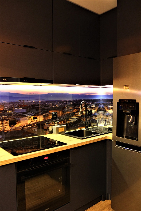 Kuchnia jest jasna, otwarta i połączona z salonem, wyposażona w niezbędne sprzęty: lodówka z zamrażalką, płyta elektryczna, piekarnik, mikrofala, meble w zabudowie z wieloma szafkami i szufladami