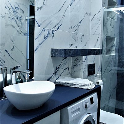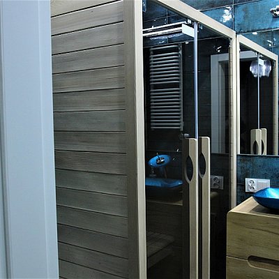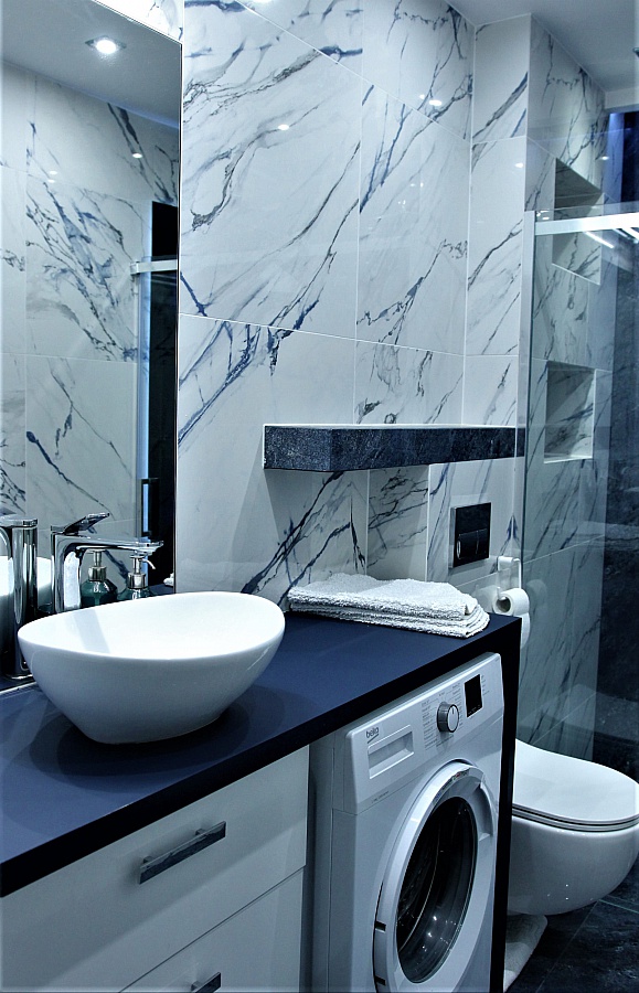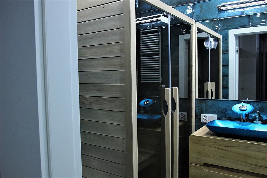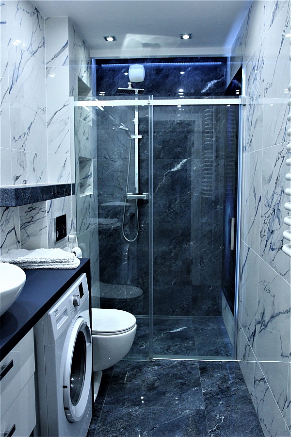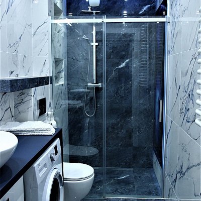 W pierwszej łazience znajduje się, kabina prysznicowa z deszczownicą, pralka oraz umywalka z lustrem -