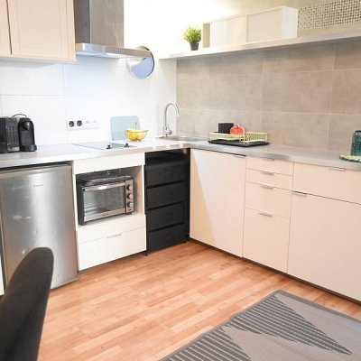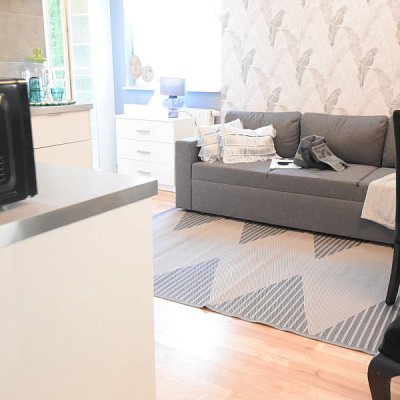 pokój dzienny z w pełni wyposażonym aneksem kuchennym (lodówka, płyta indukcyjna, mikrofalówka, mały piekarnik),