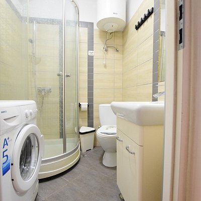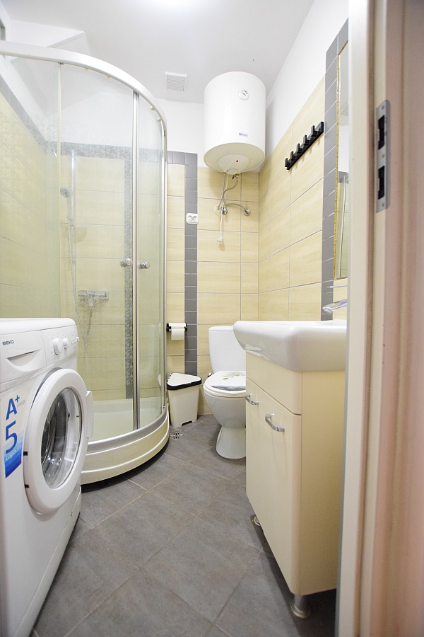 - łazienki w której znajduje się kabina prysznicowa, umywalka z szafką, WC oraz pralka.