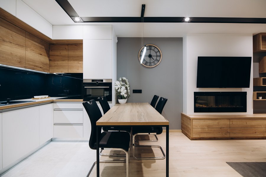 Kuchnia w pełni wyposażona (lodówka, zmywarka, piekarnik, płyta grzewcza, mikrofalówka)