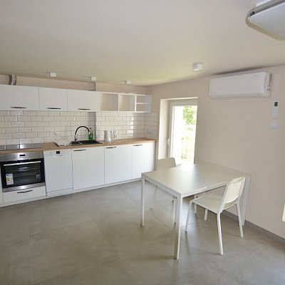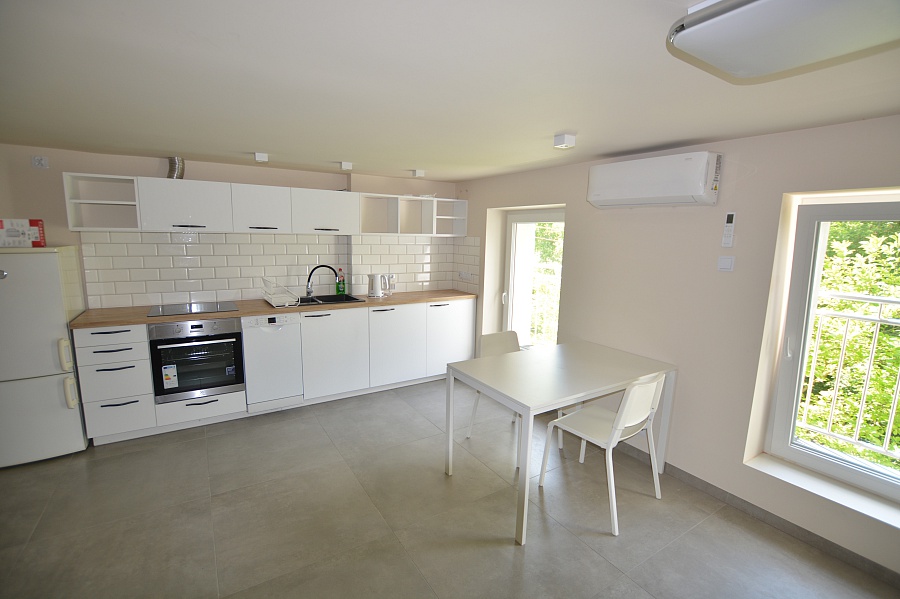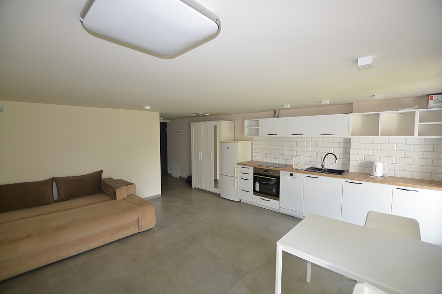 Aneks kuchenny jest wyposażony w płytę indukcyjną, piekarnik, zmywarkę oraz lodówkę.