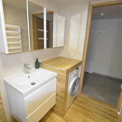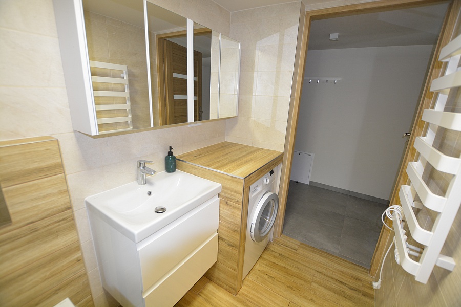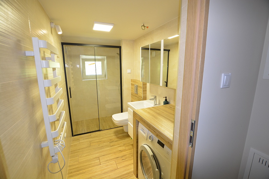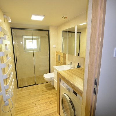 W łazience znajdziemy: prysznic, umywalkę z szafką, lustro oraz WC.