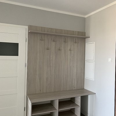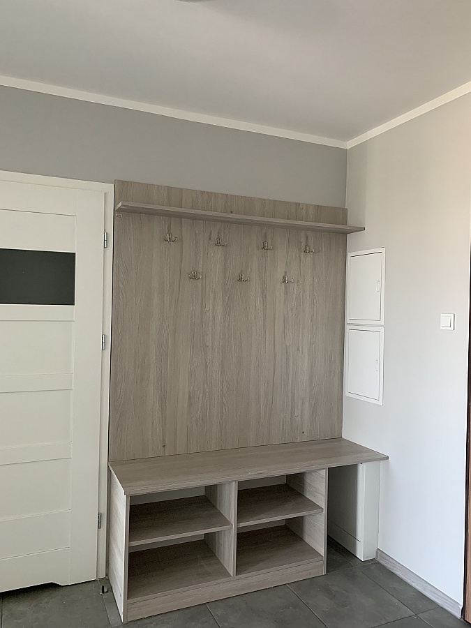Przestronny jasny przedpokój daje nam poczucie dużej przestrzeni znajdziemy w nim półkę na buty oraz wieszaki na torebki i kurtki oraz dodatkowo możemy usiąść i wygodnie założyć buty.
