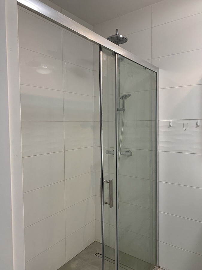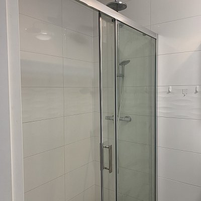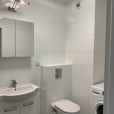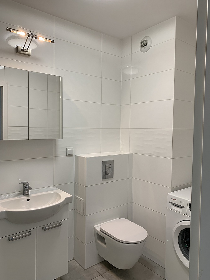 W łazience znajdziemy pralkę, prysznic walk-in, umywalkę, WC oraz grzejnik drabinkowy.